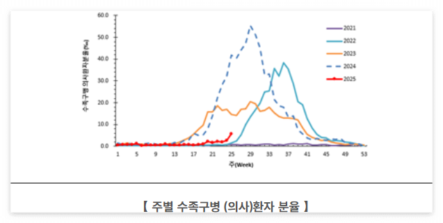 질병관리청에 따르면 2025년 6월 셋째 주(6.15.~6.21.) 기준 수족구병 의사환자 분율은 다음과 같습니다.