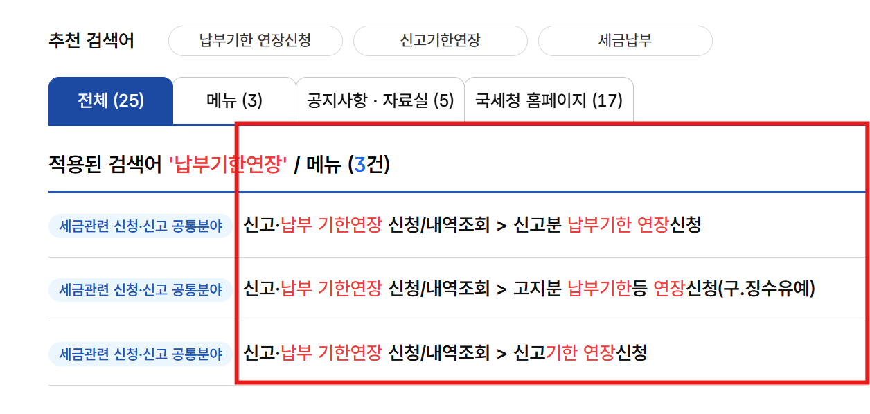 - 손택스: 전체메뉴 → 세금관련 신청/신고 → 납부기한 연장 신청