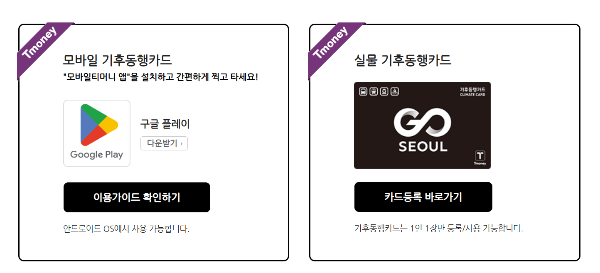 ‘모바일티머니’ 앱 다운로드 및 회원가입 후 기후동행카드 메뉴에서 카드 발급 및 충전을 선택하면 됩니다.