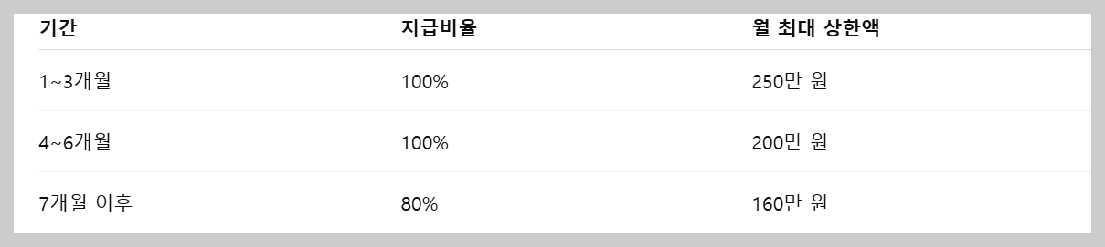 7개월 이후에는 일반 급여 규정(80%, 월 160만원 한도)이 적용됩니다.