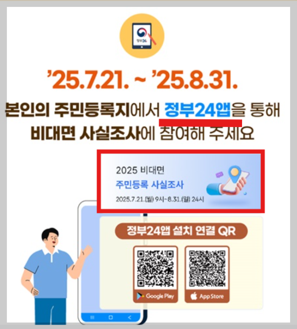 특히, 7월 21일부터 시작되는 비대면 사실조사는 반드시 ‘정부24 앱’을 통해서만 참여할 수 있다는 점을 꼭 기억해 주세요.