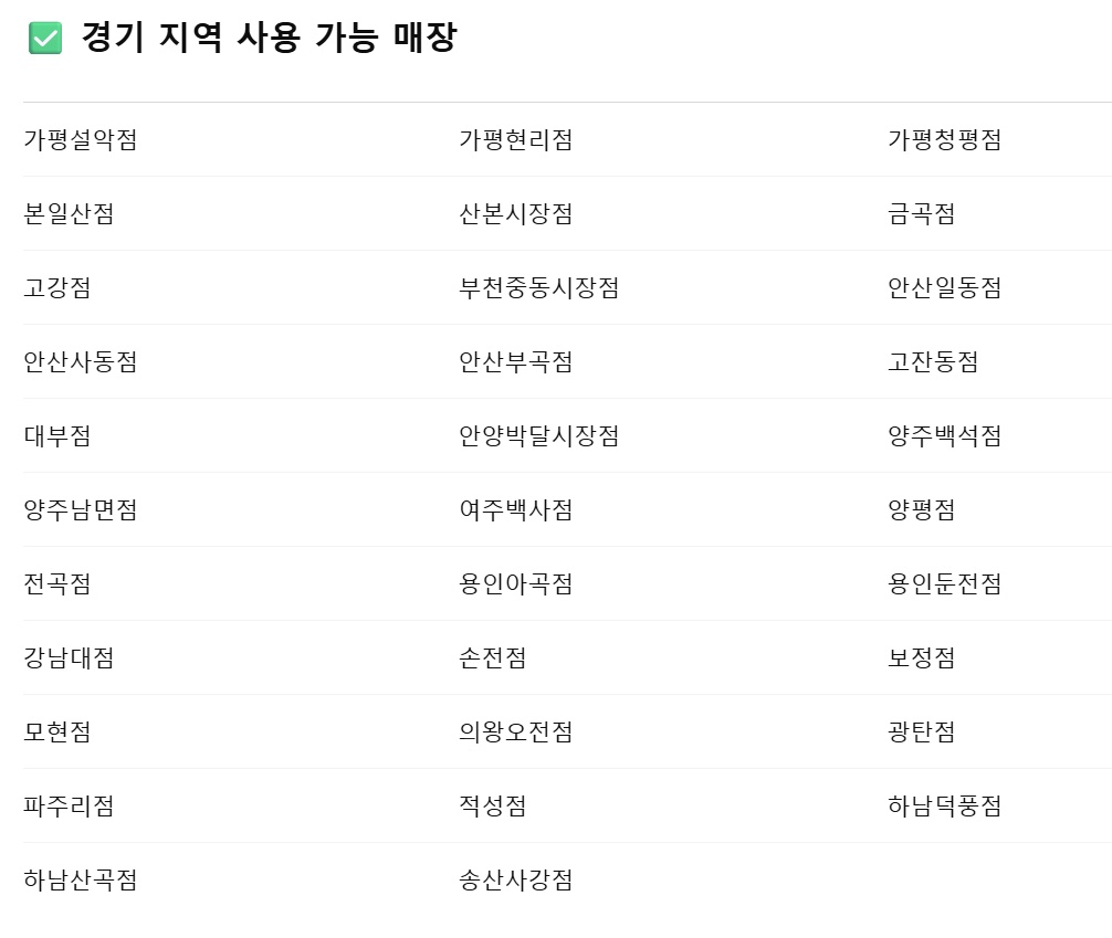 경기 지역도 가평, 산본, 안산, 하남 등 다양한 지역에서 지정된 가맹점에 한해 사용이 허용됩니다.