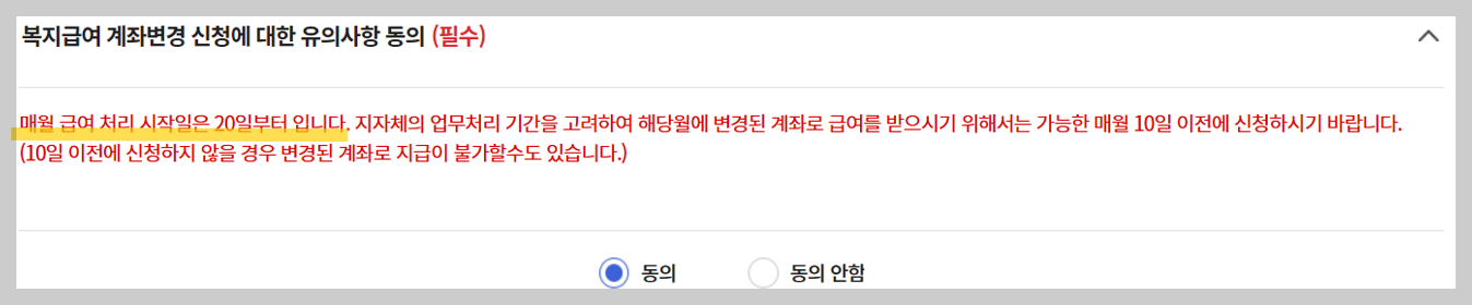 변경된 계좌로 해당 월부터 지급받고자 한다면 늦어도 10일 이전에는 신청을 완료해야 합니다.