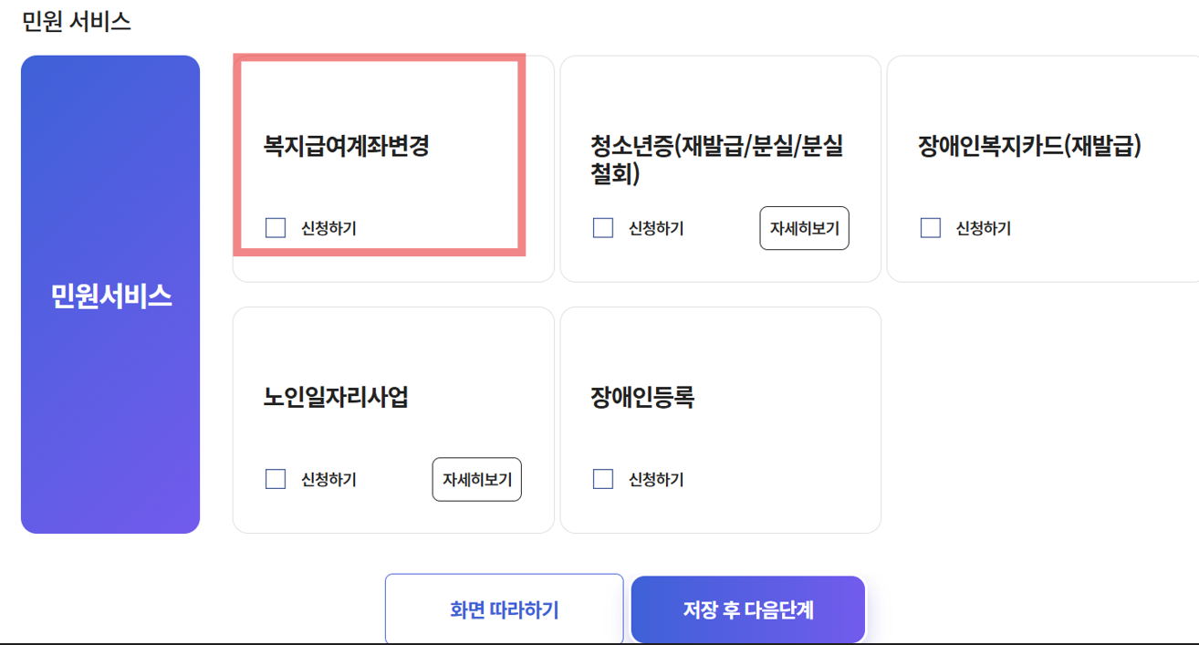 복지급여계좌변경 서비스를 찾으면 바로 신청할 수 있습니다.