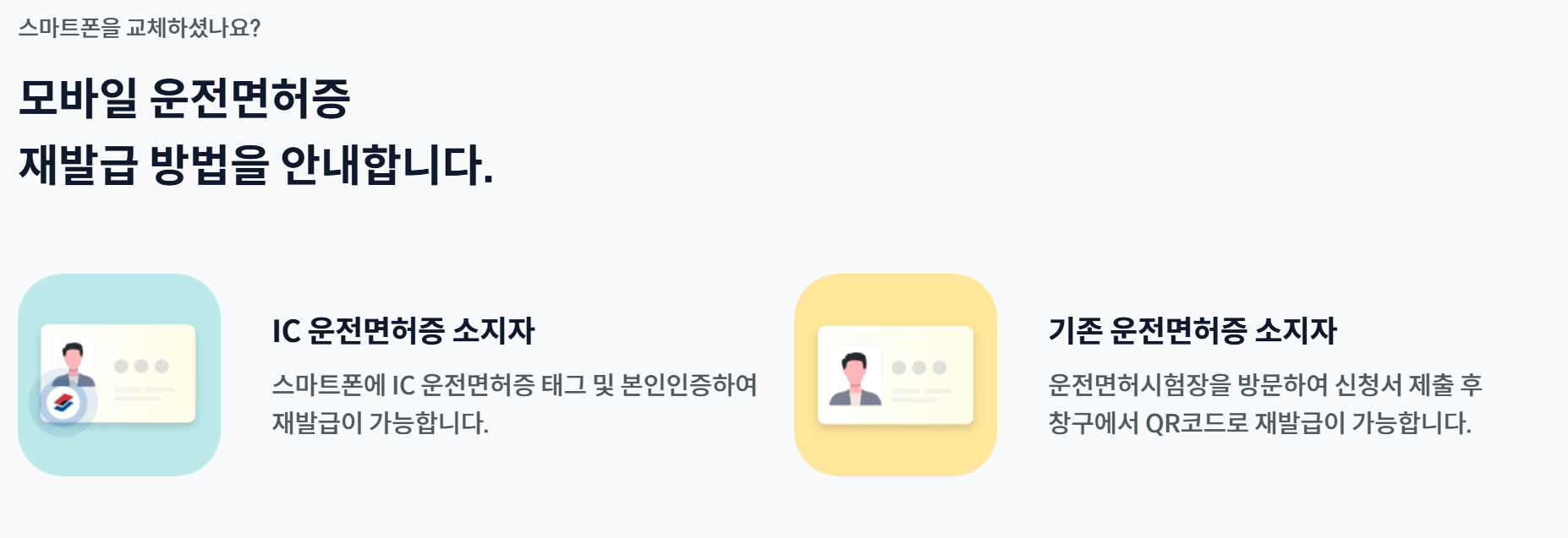 만약 적성검사(갱신) 기간이 도래했거나 운전면허증을 분실한 경우라면 실물 IC 운전면허증 발급이 필요합니다.